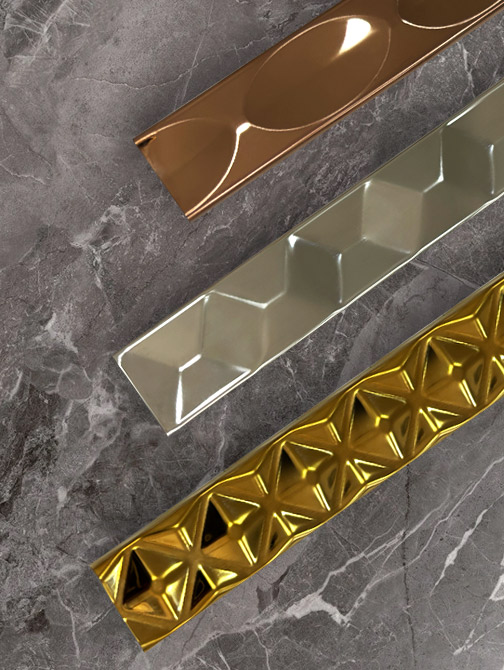 Paslanmaz çelik desenli bordür profilleri, pramit, damla ve baklava desen seçenekleriyle kimyasal parlak, sarı, bronz ve siyah renklerde sunulmaktadır. Estetik ve dayanıklı bir çözüm sunar.